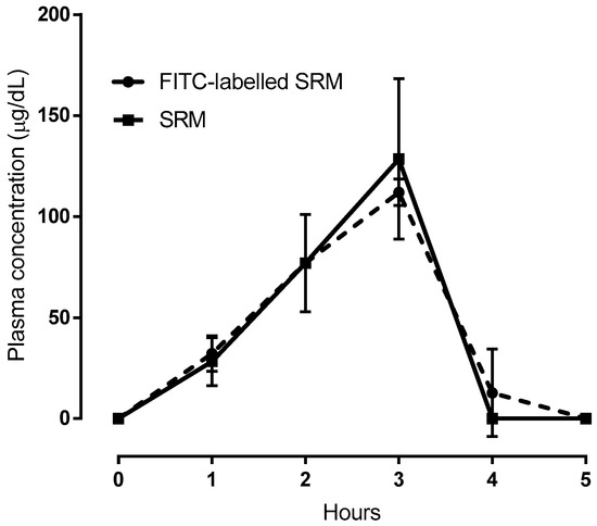 In vivo bioavailability studies were also carried out on FITC-labeled SRM samples. To this end, one of the SRM excipients that had been suggested to be responsible for vesicle formation was monitored after labeling with FITC. In fact, the data represented in Figure 7, net of the basal Fe3+ concentration values, highlight the virtual superimposition of the plasma concentration versus time profile determined for the FITC-labeled excipient and the Fe3+. Since the iron and labeled excipient contents formulated in SRM are equal, the data superimposition in Figure 7 could well be explained by admitting that a fraction of the administered iron-loaded SRM formulation traveled unmodified from its application site along the GI tract and across the intestinal barrier to reach the bloodstream. Quantifying such a fraction, however, was deemed to be of modest interest for the present study, as the in vivo experiments were carried out with animals, not humans. Therefore, the ex tempore formation of nano-vesicles upon SRM contact with physiological fluids and vesicle intestinal absorption by a biological mechanism, not accompanied by any vesicle impairment, is a faithful interpretation of data.