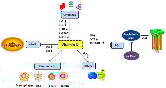 In the context of cancer, the role of the immune system is not straightforward. Interactions can occur between cancer cells and host immune cells in the tumor microenvironment to create an immunosuppressive network that promotes tumor growth and protects the tumor from immune attack []. Population-based studies, as well as molecular studies, have demonstrated that vitamin D is implicated in many immune-related diseases, such as asthma, atherosclerosis, type 2 diabetes, and autoimmune diseases [,]. Recent studies indicated that a persistent inflammatory microenvironment can induce tumor production [,,,,,]. In the course of the development of the tumor, some immune cells often change from the “protector” of self-organizations to the “accomplice” of tumor cells, and nourish the cancer []. By mediating complex pathways, the tumor inflammatory microenvironment induces the expression of a variety of pro-inflammatory cytokines, promotes angiogenesis and tumor growth, invasion and metastasis, and accelerates the development of tumors [,,,]. Several mechanisms for how vitamin D affects inflammatory microenvironment in cancers have been explored, including regulating the interaction between immune and tumor cells to regulate the levels of cytokines, inhibiting NF-κB signaling pathway, up-regulating MKP5, and inhibiting the prostaglandins pathway and immune cells (macrophages, DCs, B cells, and T cells) [,] (Figure 2). Non-steroidal anti-inflammatory drugs (NSAIDs) are generally used to relieve acute pain and treat chronic inflammation, such as arthritis, among which the most commonly used are aspirin, ibuprofen, and piroxicam. A recent study has confirmed that NSAIDs have a certain degree of anti-tumor effect, which further confirms the close relationship between inflammation and cancer [].
