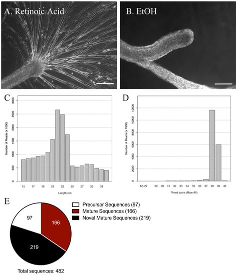 The CNS of Lymnaea was removed from the animal by transecting all nerves emanating from the CNS to the periphery. The CNS was incubated in either RA (10−5 M) or EtOH (0.1%; vehicle control) for 72 h, which was sufficient time for a regenerative response to occur. We found that when dissected CNS were incubated in RA, the nerves exhibited robust neurite sprouting (Figure 1A), which did not occur in CNS incubated in EtOH alone (Figure 1B). Total RNA was isolated from pooled samples of both RA-treated (regenerating/sprouting) and EtOH-treated (non-regenerating) tissues 72 h following treatment, and submitted for miRNA sequencing analysis.