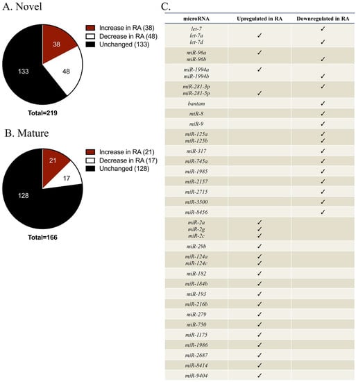 Mature miRNAs that were differentially expressed between regenerating CNS incubated in RA, or non-regenerating CNS incubated in EtOH; (A) Pie chart depicts the total number of novel sequences identified by miRNA sequencing. Of these sequences, 38 exhibited at least a 2-fold increase in CNS incubated in RA (red), while 48 displayed at least a 2-fold reduction in RA-treated samples (white); (B) Pie chart depicts the total number of mature miRNA sequences identified by miRNA sequencing analysis. Of the identified sequences, a large proportion did not exhibit differential expression between CNS incubated in RA and EtOH (black). However, a small subset exhibited at least a 2-fold change between treatment groups, and were either upregulated (red) or downregulated (white) in RA-treated CNS; (C) A complete list of differentially expressed mature miRNAs following RA treatment. Table indicates the mature miRNA name and its corresponding expression pattern in regenerating RA-treated CNS.
