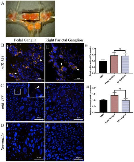Expression of microRNAs 124 and 133 in different ganglia of the Lymnaea CNS. (A) Representative image of a Lymnaea CNS (Scale bar = 1 mm). Boxes represent different ganglia of the CNS, including the pedal ganglia and the right parietal (RP) ganglion; (B) miR-124 demonstrates a perinuclear distribution in both the pedal (Bi) and right parietal (Bii) ganglia. Arrowheads indicate representative areas of expression. RT-qPCR analysis demonstrates uniform expression across both ganglia (Biii); (C) Little to no miR-133 signal is detectable in either the pedal ganglia (Ci), or the right parietal ganglion (Cii). When examining miR-133 utilizing RT-qPCR, we detected similar expression when comparing the pedal and right parietal ganglia, however, this expression was minimal. For RT-qPCR, data was made relative to the expression in the entire Lymnaea CNS, and normalized to β-tubulin, actin, and eIF4α; (D) Representative image of ganglia sections incubated with a scrambled probe (negative controls). No signal was detected in either pedal (Di) or right parietal (Dii) ganglia. Scale bars (B–D) = 50 μm.