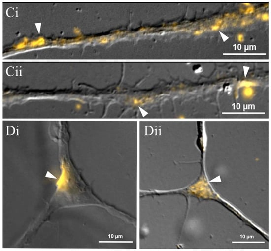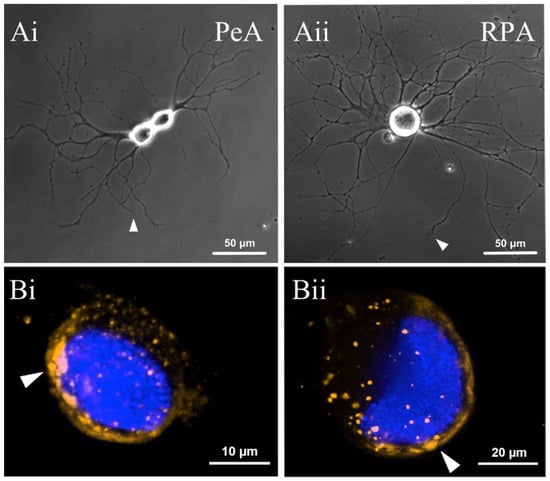 In the cultured regenerating motorneurons (Figure 5A), miR-124 was consistently expressed within the cell bodies of both PeA (n = 46, Figure 5(Bi)) and RPA (n = 41, Figure 5(Bii)) cell types. Once again, miR-124 clearly exhibited a perinuclear distribution within the soma, similar to the expression pattern we found in the ganglia. miR-124 was also detected within regenerating neurites of both PeA (Figure 5(Ci)) and RPA motorneurons (Figure 5(Cii)). Interestingly, miR-124 was expressed as individual punctae along the length of PeA and RPA neurites (Figure 5C). However, miR-124 was not consistently expressed in all neurites of either cell type, with its expression in RPA neurites being less frequent in comparison to PeA neurites (Figure 5C). Interestingly, miR-124 expression was often abundant in branch points of both PeA (Figure 5(Di)) and RPA (Figure 5(Dii)) neurites.