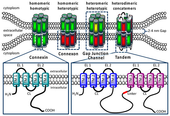 - Koval, M.; Molina, S.A.; Burt, J.M. Mix and match: Investigating heteromeric and heterotypic gap junction channels in model systems and native tissues. FBBS Lett. 2014, 588, 1193–1204. [Google Scholar] [CrossRef] [PubMed]