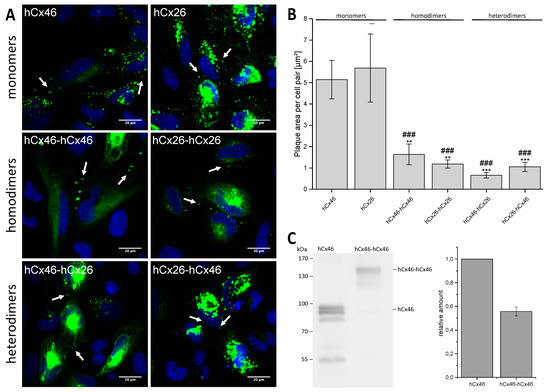 Expression of the GFP-labeled monomeric and concatemeric connexins in HeLa cells. (A) Representative micrographs of cell pairs expressing GFP-labeled hCx46, hCx26, hCx46-hCx46, hCx26-hCx26, hCx46-hCx26, and hCx26-hCx46 are shown. The cells were imaged 24 h after transfection using a confocal laser scanning microscope. The nuclei (blue) were stained with Hoechst 33342. Gap junction plaques are indicated by arrows. Gap junction plaques were found in HeLa cells expressing hCx46, hCx26, and the four different tandems. In cells expressing the tandems, a trend to accumulate the proteins in intracellular organelles was observed. (B) Quantification of the gap junction plaque area formed by the monomers and the four different tandems in HeLa cells. The plaque area was calculated using the particle analyzer of ImageJ and normalized to the number of transfected cell pairs. At least three transfections were performed per construct. The results are given as average plaque area per cell pair [µm2]. Error bars represent the SEM. The data were evaluated by a one-way ANOVA and a post-hoc Tukey test (** p ≤ 0.01, *** p ≤ 0.001) in comparison to hCx46 and hCx26 (### p ≤ 0.001). (C) Quantification of the relative protein amount in HeLa cells expressing the monomeric hCx46-GFP or the homodimeric hCx46-hCx46-GFP. An anti-Cx46 antibody was used for the western blotting. For the quantification, four independent replicates were analyzed by using the gel analyzer tool of the FiJi software [32]. The data was normalized to the intensity of the hCx46 monomer.