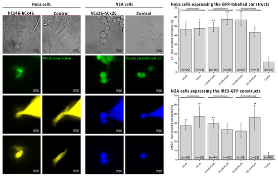 For the dye transfer experiments, a whole-cell patch-clamp configuration was established on one cell of a transfected cell pair using an EPC 10 USB double patch-clamp amplifier (HEKA Elektronik Dr. Schulze GmbH, Lambrecht/Pfalz, Germany) coupled to the PatchMaster 2.9 software (HEKA Elektronik Dr. Schulze GmbH). For the pipette filling solution used for the HeLa cells, 1 mg/mL Lucifer Yellow (LY) lithium salt (Biotium, Hayward, CA, USA) was diluted in a pipette medium containing (in mM) 145 K gluconate, 5 KCl, 10 HEPES, 2.5 MgATP, 5 glucose, 0.5 Na2ATP, 1 EGTA, and 0.2 CaCl2 at pH 7.4 and π 295 mosmol/L. For the experiments with N2A cells, the LY was replaced by 1 mg/mL AMCA (Sigma Aldrich, St. Louis, MO, USA). The Polychrome V was used to excite the GFP-labeled connexin variants at 488 nm, LY at 410 nm, and AMCA at 350 nm. For each dye transfer experiment, micrographs of the GFP and LY or AMCA fluorescence were taken before the whole-cell configuration was established, during the experiment, and after 10 min with prior removal of the LY or AMCA containing pipette. For each variant, the degree of dye coupling was estimated as the ratio of the number of coupled pairs to the total number of tested pairs expressing the particular variant. The results are given as mean values ± SEM. The significance of the difference was evaluated by a one-way ANOVA and a post-hoc Tukey test (*** for p ≤ 0.001, ** for p ≤ 0.01, and * for p ≤ 0.05).