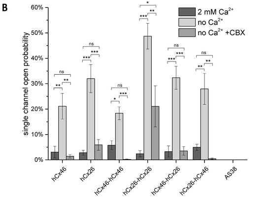 Analysis of single hemichannels formed by concatemeric connexins. The stripped membrane of Xenopus oocytes, which were injected with hCx46, hCx26, or the four different concatemeric constructs, as well as the AS38 (control) cRNA 24 h before, was used to perform the inside-out patch-clamp recordings. The measurements were performed in presence of Cs+ and in absence of Cl− on both sides of the membrane. (A) Examples of single channel currents elicited by a depolarizing voltage pulse of +50 mV in absence of Ca2+ in the bath solution are shown. (B) The open probability of all measured single channels was analyzed. The error bars represent the SEM. The data were evaluated by a one-way ANOVA followed by a Tukey test (* p ≤ 0.05, ** p ≤ 0.01, *** p ≤ 0.001, ns: not significant). The statistical comparison showed that the presence of Ca2+ or carbenoxolone (CBX) in the bath solution significantly reduced the open probability of all tested variants.