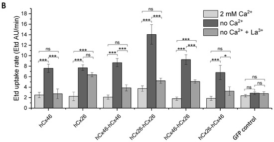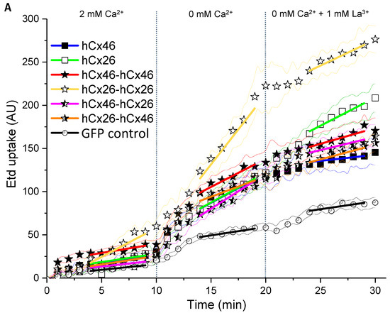 Using ethidium bromide (Etd), we observed the dye uptake by HeLa cells expressing hemichannels formed by the different variants in order to clarify how the constructed tandems could affect the function of the channels. First, we found that the cells expressing the monomers or the tandems in different variations did not differ from mock cells in their capacity to absorb ethidium bromide as long as external Ca2+ was present (Figure 5). The dye uptake in presence of external Ca2+ was therefore considered as background uptake. Specific hemichannel uptake of the dye was initialized when the cells were superfused with a Ca2+-free external solution (Figure 5). To determine a possible mechanical effect on the dye uptake, the cells were first superfused with a 2 mM Ca2+-containing solution. In cells expressing the homodimeric hCx26-hCx26, a tendency to increase the rate of dye uptake during the perfusion with the Ca2+-containing solution was observed. However, this mechanical sensitivity of the channel was not statistically significant when analyzed by a two-way ANOVA and a post-hoc Tukey test. For cells expressing the GFP control or the other variants, the tendency to respond to a mechanical stimulus was not observed (Figure 5). For all variants, the ethidium bromide uptake was accelerated by the superfusion of the cells with Ca2+-free external solution compared to cells expressing the GFP control (Figure 5A,B and Figure S2: Table in the Supplemental Materials). In the context of low external Ca2+, only the hCx26-hCx26 homodimer showed an increased rate of dye uptake compared to the monomeric hCx26 and hCx46, as well as the hCx46-hCx46 homodimer and both heterodimers (S2). These changes in the ethidium bromide dye uptake rate seems to be an artifact due to the concatenation. For hCx46 however, the hCx46-hCx46 homodimer as well as the hCx46 monomer showed a comparable rate of dye uptake, and this uptake rate of hCx46 was also measured for the heterodimers in either order. Additionally, dye uptake by hemichannels in all variants except for the hCx26 monomer (and the GFP control cells) was significantly reduced by the superfusion with a La3+-containing medium. When using a two-way ANOVA and a post-hoc Tukey test for the comparison of the different variants, neither the perfusion with the Ca2+-containing solution nor the perfusion with a Ca2+-free and La3+-containing solution showed a significant difference to another variant or the GFP expressing control cells. Only the perfusion with the Ca2+-free solution led to significant differences, as described above (S2).