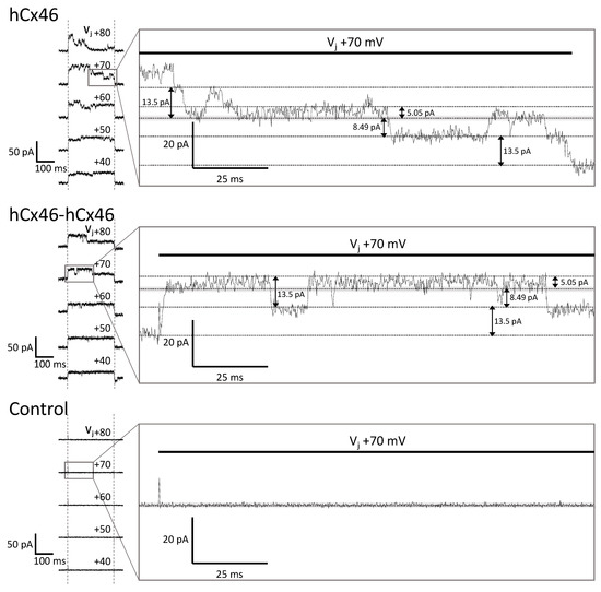 Recordings of dual whole-cell patch-clamp experiments. N2A cells were cultured and transfected with the different IRES-GFP-plasmids. As control, cells expressing only soluble GFP in the cytosol were used. Twenty-four hours post transfection, the dual whole-cell patch-clamp experiments were performed. The resting membrane potential was set to −40 mV for both cells. One cell of a cell pair was alternatingly stepped from −120 mV to +60 mV, while the junctional currents were recorded in the other cell. The junctional currents (ΔI2) recorded during the 250 ms-long voltage pulses at different transjunctional potentials are shown above the current responses. Magnification of the Vj +70 mV traces of the hCx46 monomer, as well as of the hCx46-hCx46 homodimer, showed several simultaneously open channels, with a large conductance of ~193 pS (13.5 pA step), and low conductance of ~72 pS (5.05 pA step) and ~121 pS (8.49 pA step). Similar steps were observed for Cx46 by other authors [38,39,40,41]. The control cells showed only the background noise, which was below 2 pA (grey band), indicating that the fluctuations of about 5 pA were conducting substates.
