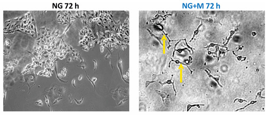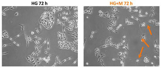 The morphology of SKOV-3 cells cultured in NG and HG treated with 10 mM metformin for 24, 48, and 72 h examined under an inverted optical microscope (Olympus IX70, Tokyo, Japan) [14] is presented in Figure 2 and Figure 3. A small percentage of SKOV-3 cells cultured in NG for 24, 48, and 72 h exhibited morphological changes such as elongation and thinning. In turn, exposure of SKOV-3 cells cultured in NG to metformin pronouncedly increased the number of deteriorated cells in a time-dependent manner. Elongated, single thin cells were detected after just 24 h of exposure to metformin and their number increased after prolonged treatment with the drug (Figure 2). In the case of SKOV-3 cells cultured in HG, morphological changes appeared after 48 h of incubation. Both culture in HG for 48 h and 72 h caused elongation and thinning of the cells, while we also detected slightly smaller cells after 72 h. We found distinctly small, elongated and disintegrated SKOV-3 cells cultured in HG and metformin. Even 24 h exposure to metformin induced deterioration of cells cultured in HG. We also noted that prolonged treatment with metformin (48, 72 h) led to cell disintegration and detachment of the cells from the culture well surface (Figure 3).
