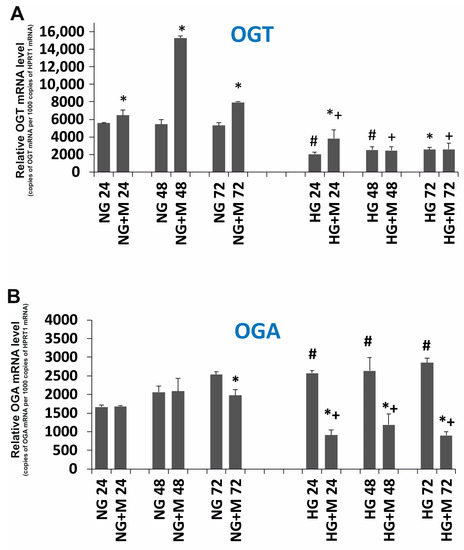 Relative (A) OGT (O-linked β-N-acetlyglucosamine transferase); (B) OGA (O-GlcNAcase) mRNA expression detected after 24, 48, and 72 h in metformin-treated and untreated ovarian cancer cell line SKOV-3 cultured in NG and in HG. NG—cells cultured in normoglycemia, NG + M—cells cultured in normoglycemia and treated with metformin, HG—cells cultured in hyperglycemia, HG + M—cells cultured in hyperglycemia and treated with metformin, (*) Statistically significant differences between the cells exposed to metformin in comparison to unexposed cells at the same time points, p < 0.05; (#) statistically significant differences between cells cultured in HG in comparison to those cultured in NG at the same time-points p < 0.05; (+) statistically significant differences between metformin-treated cells in HG in comparison to metformin-treated cells cultured in NG at the same time points, p < 0.05.