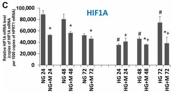 Relative (A) SLC2A1 (GLUT1); (B) SLC2A3 (GLUT3); (C) HIF1A mRNA expression detected after 24, 48, and 72 h in a metformin-treated and untreated ovarian cancer cell line (SKOV-3) cultured in NG and in HG. NG—cells cultured in normoglycemia, NG + M—cells cultured in normoglycemia and treated with metformin, HG—cells cultured in hyperglycemia, HG + M—cells cultured in hyperglycemia and treated with metformin. (*) Statistically significant differences between the cells exposed to metformin in comparison to unexposed cells at the same time points, p < 0.05; (#) statistically significant differences between cells cultured in HG in comparison to those cultured in NG at the same time points p < 0.05; (+) statistically significant differences between metformin-treated cells in HG in comparison to metformin-treated cells cultured in NG at the same time points, p < 0.05.