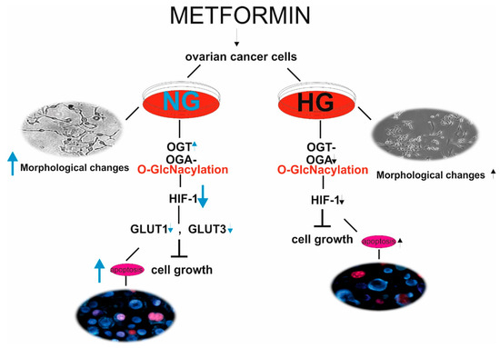 Metformin acts through a HIF1A/GLUT-dependent mechanism in SKOV-3 cells. The response of ovarian cancer cells to metformin depends on the level of glycemia, which affects diversely OGT and OGA expression and O-GlcNAcylation status. In NG, metformin increases the expression of OGT and downregulates HIF1A and GLUT expression leading to SKOV-3 cell apoptosis. HG dysregulates OGT and OGA expression and related HIF1A and GLUT expression preventing metformin-stimulated inhibition of growth and proliferation of SKOV-3 cells. Black arrows (HG conditions), blue arrows (NG conditions)—the height of arrow indicates intensification and direction of apoptotic changes, morphological changes and expression of the examined genes.