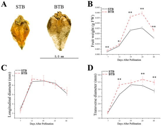 Fruit growth patterns of different accessions of Tartary buckwheat. (A) Pictures of mature fruits of the two accessions. (B) Average fresh weight of one fruit of the two Tartary buckwheat accessions (STB, black squares; BTB, red circles) is plotted against the developmental stages (days after pollination) (n = 5). (C) Average longitudinal diameter of one fruit of the two Tartary buckwheat accessions (STB, black squares; BTB, red circles) is plotted against the developmental stages (days after pollination) (n = 5). (D) Average transverse diameter of one fruit of the two Tartary buckwheat accessions (STB, black squares; BTB, red circles) is plotted against the developmental stages (days after pollination) (n = 5); * and ** indicate significant differences (α = 0.05; α = 0.01, least significant difference test (LSD)) among treatments, respectively.
