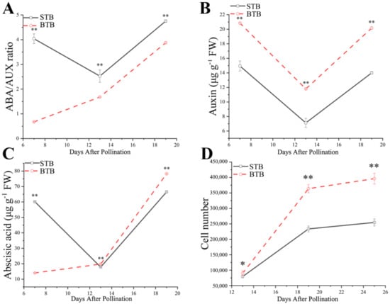 Endogenous hormones play an extremely important role in fruit growth and embryonic development. AUX and ABA are the key hormones to control the embryogenesis pattern and promote the accumulation of storage products during the subsequent filling stage [,], which are closely related to the phenomenon of delayed pre-embryonic development and the many starch grains in the endosperm of BTB. Therefore, the contents of total AUX and ABA during fruit development of the two materials were determined quantitatively. Based on determination of AUX and ABA in the fruits from 7 to 19 DAP by high performance liquid chromatography (HPLC), we observed the accumulative patterns of AUX and ABA in the two materials. The results showed that from 7 to 19 DAP, the accumulative pattern of AUX was the same in the two materials (Figure 3B); whereas the ABA accumulation pattern was different (Figure 3C). The ABA content in the fruit of BTB was relatively low at 7 DAP, and the content in fruit increased with time to 19 DAP (Figure 3C). When STB was at 7 DAP, the ABA content of fruit was relatively high, and the content from 7 to 19 DAP decreased first and then increased (Figure 3C). To summarize, the difference between STB and BTB hormone accumulation models was primarily the difference in ABA accumulation pattern from 7 to 13 DAP. This difference in ABA accumulation patterns led us to compare the ratio of ABA to AUX accumulation from 7 to 13 DAP. We observed that the pattern of BTB and STB was very different, particularly the ratio of ABA to AUX (Figure 3A). The ratio of ABA/AUX in STB was negatively correlated with the fruit development model (Figure 1B) and cell proliferation rate (Figure 3D) from 7 to 13 DAP. From 13 to 19 DAP, the rate of ABA/AUX ratio was similar, and the rate of cell proliferation was similar. Therefore, we hypothesized that at the early stage of fruit development (from 7 to 13 DAP), the high ratio of ABA/AUX accelerated the early entry of embryos into the cotyledon embryo stage, and ABA accelerated embryo maturation (or aging). Under the same ratio of ABA/AUX (from 13 to 19 DAP), the difference in fruit growth power and cell proliferation was presumably due to the response factors of related hormones.