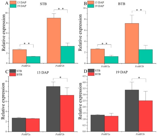 Expression analysis of the two FtARF2 genes in the different accessions of Tartary buckwheat fruits at 13 and 19 DAP. (A) Expression analysis of the two FtARF2 genes in STB fruit at 13 and 19 DAP. (B) Expression analysis of the two FtARF2 genes in BTB fruit at 13 and 19 DAP. (C) Expression analysis of the two FtARF2 genes in the different accessions of Tartary buckwheat fruits at 13 DAP. (D) Expression analysis of the two FtARF2 genes in the different accessions of Tartary buckwheat fruits at 19 DAP. * and ** indicate significant differences at 0.05 and 0.01 levels, respectively.