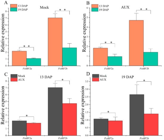 Expression analysis of the two FtARF2 genes in the STB fruits at 13 and 19 DAP under mock and IAA treatments. (A) Expression analysis of the two FtARF2 genes in the STB fruits at 13 and 19 DAP under mock treatments. (B) Expression analysis of the two FtARF2 genes in the STB fruits at 13 and 19 DAP under IAA treatments. (C) Expression analysis of the two FtARF2 genes in the STB fruits at 13 DAP under mock and IAA treatments. (D) Expression analysis of the two FtARF2 genes in the STB fruits at 19 DAP under mock and IAA treatments. * and ** indicate significant differences at 0.05 and 0.01 levels, respectively.