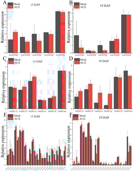 Expression analysis of FtAux/IAAs, FtGH3s, and FtSAURs genes in STB fruits at 13 and 19 DAP under mock and IAA treatments. (A) Expression analysis of FtAux/IAA genes in STB fruits at 13 DAP under mock and IAA treatments. (B) Expression analysis of FtAux/IAA genes in STB fruits at 19 DAP under mock and IAA treatments. (C) Expression analysis of FtGH3s genes in STB fruits at 13 DAP under mock and IAA treatments. (D) Expression analysis of FtGH3s genes in STB fruits at 19 DAP under mock and IAA treatments. (E) Expression analysis of FtSAURs genes in STB fruits at 13 DAP under mock and IAA treatments. (F) Expression analysis of FtSAURs genes in STB fruits at 19 DAP under mock and IAA treatments. * and ** indicate significant differences at 0.05 and 0.01 levels, respectively.