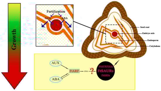 In our model, from fertilization to embryo maturation, the expansion of fruit volume is from the continuous division of embryonic cells, which is strongly influenced by hormones, which may be due to the fertilization potential of plants themselves. The premature maturation of the embryo reduces the cycle of cell division and affects the accumulation of storage materials in later stages, thereby affecting the final volume of the fruit. The balance of AUX and ABA may be the key factors to regulate the cell division cycle. ARF has three potential target genes (AUX/IAA, GH3, SAUR) in the hormone regulation pathway [,,,,]. In Tartary buckwheat, through the response of ARF2 and downstream SAURs in the hormone signaling pathway, the result is the continuous expansion of fruit volume and accumulation of storage materials. However, whether these downstream FtARFs target genes (FtSAURs) are involved in the auxin signaling pathway is uncertain. To confirm the regulation mechanism of the entire pathway on the fruit volume of Tartary buckwheat, the downstream genes require further study (Figure 7).