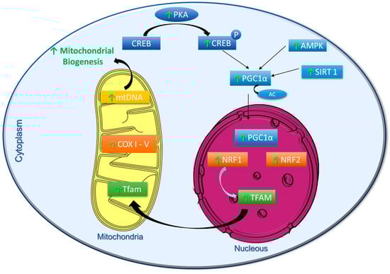 Schematic representation of metabolic pathways stimulated by polyphenols to activate mitochondrial biogenesis. PKA—Protein Kinase A; CREB—cyclic AMP response element binding protein; PGC1α—peroxisome proliferator-activated receptor gamma coactivator 1α; AMPK—AMP protein kinase; SIRT1—Sirtuin 1; NRF1/2—nuclear respiratory factors 1 and 2; mtDNA—Mitochondrial DNA; OXPHOS I-V—Oxidative phosphorylation complexes I to V; TFAM—Mitochondrial transcription factor A; P—Phosphorylation; AC—Acetylation; ↑—Polyphenol Induction.