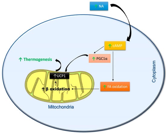 Schematic representation of metabolic pathways stimulated by polyphenols to activate thermogenesis. NA—noradrenaline; cAMP—cyclic adenosine monophosphate; PGC1α—peroxisome proliferator-activated receptor gamma coactivator 1α; FA—Fatty acid oxidation; β oxidation—Beta oxidation; UCP-1—Uncoupling protein 1; ↑—Polyphenol Induction.