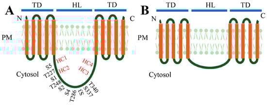 Molecular structures of (A) long PIN proteins (PIN1–4, 6 and 7) and (B) short PIN proteins (PIN 5 and 8). The PIN proteins harbor a typical central long hydrophilic loop (HL) between amino- and carboxy-terminal ends with five transmembrane domains (TD) spanning on the plasma membrane (PM). The phosphosites on the HL of long PINs are shown [6]. The conserved HC1–HC4 regions in the central loop domain are also indicated according to Bennett et al. [36].