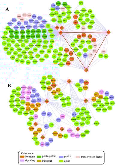 (A) The co-expression network of PIN genes and (B) the PIN protein interaction network in Arabidopsis. The network was constructed using an online database, CressExpress (available online: http://cressexpress.org/home.xhtml). This was done using pathway-level co-expression (PLC) analysis as suggested by Wei et al. [71] and visualized in Cytoscape (3.5.0) [86]. In the co-expression network, the lines between nodes represent significant correlations between two genes. The red lines represent significant correlations between PIN genes. The protein-protein interaction network was constructed using Cytoscape with data from the BioGRID database [87] (available online: https://thebiogrid.org/). In the PIN protein interaction network, the lines between nodes represent physical interactions verified by experimental approaches (for detail, see Table S1). The PIN genes/PIN proteins are represented by diamonds, and other co-expressed genes/interactive proteins are represented by circles. The different colors indicate different functional categories assigned by Mapman software [88], as shown by color codes.