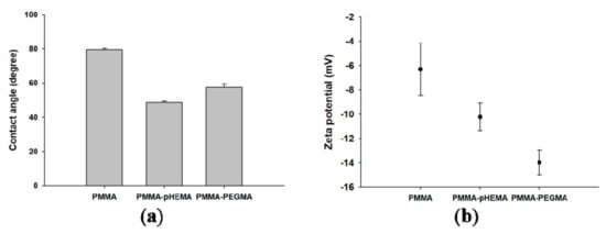 (a) Contact angles expressed in degrees and (b) zeta potentials (mV) of PMMA, PMMA-pHEMA, and PMMA-PEGMA.