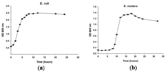 Bacterial growth curves of (a) E. coli and (b) S. mutans with an initial concentration of 0.1 OD600.