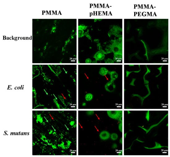 Confocal laser scanning microscope (CLSM) images of PMMA, PMMA-pHEMA, and PMMA-PEGMA discs without bacterial inoculation (top row) and after 2 h of E. coli (middle row) or S. mutans (bottom row) adhesion. Green arrows selectively indicate the presence of live bacteria (in green), whereas red arrows selectively indicate the presence of dead bacteria (in red).