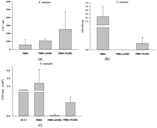Surface hydrophilicity also affected the number of live bacteria attached to the sample surface. Both PMMA-pHEMA and PMMA-PEGMA were hydrophilic. As indicated by the larger average contact angles of PMMA-PEGMA than PMMA-pHEMA (Figure 2a), PMMA-PEGMA was less hydrophilic than PMMA-pHEMA because of its longer PEG side chains than the side chain of pHEMA. Bacterial cells with hydrophobic walls were thus less repulsed by PMMA-PEGMA than PMMA-pHEMA. In addition, E. coli cells use flagella to attach to surfaces [] and S. mutans cells produce exopolysaccharides for their colonization on substrates []. A denser layer of water was formed on PMMA-pHEMA than on PMMA-PEGMA, which could have led to greater weakening of the interaction between bacteria and the material. Higher optical density (OD) and CFU/mL values of the culture medium from the second incubation for both E. coli (Figure 5b,c) and S. mutans (Figure 6b,c) were thus obtained for PMMA-PEGMA than for PMMA-pHEMA.