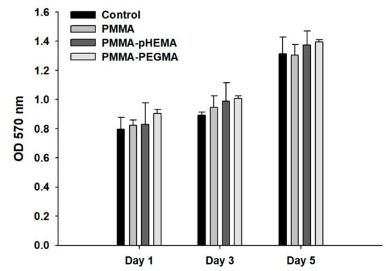 PMMA is toxic to mammalian cells because of its leaching of unreacted methyl methacrylate (MMA) []. In this study, cell viability was examined using MTT assays and the results showed no significant difference between PMMA and the control (Figure 7). The reason may have been that PMMA discs were placed in Aquapres at 1.5 kg/cm2 for 1 h to remove most of the unreacted MMA. PMMA-pHEMA and PMMA-PEGMA were also biocompatible because their cell viability was similar to the control, suggesting that leaching of toxic components was negligible. This may be an advantage of grafting compared with incorporation of antimicrobial agents throughout the bulk polymer network.