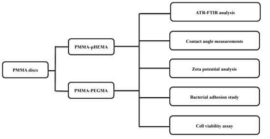 Figure 8 shows a flow diagram which presents the grafting process, applied characterization techniques, and tested groups for the antibacterial adhesion of the grafted PMMA. The detail is discussed below.