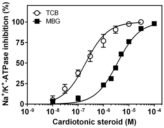 Figure 1. Inhibition curves of pig kidney Na+/K+-ATPase activity by telocinobufagin (TCB) or marinobufagin (MBG). Preparation of Na+/K+-ATPase from pig kidney was incubated with increasing concentrations of TCB or MBG for 1 h. Each point represents the mean ± SEM of three independent experiments performed in triplicate.
