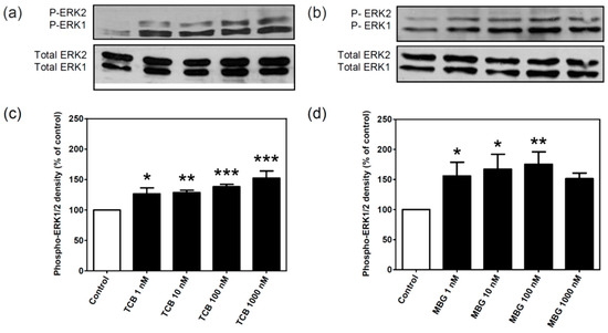 Figure 2. ERK1/2 activation by different concentrations of telocinobufagin (TCB) or marinobufagin (MBG). Serum-starved LLC-PK1 cells were treated with 1, 10, 100, and 1000 nM TCB or MBG for 15 min. Representative Western blots of phospho- and total ERK1/2 for TCB (a) and MBG (b) and relative optical density quantification in (c,d), respectively. Data are mean ± SEM of five independent experiments. * p < 0.05; ** p < 0.01; *** p < 0.005 vs. control.
