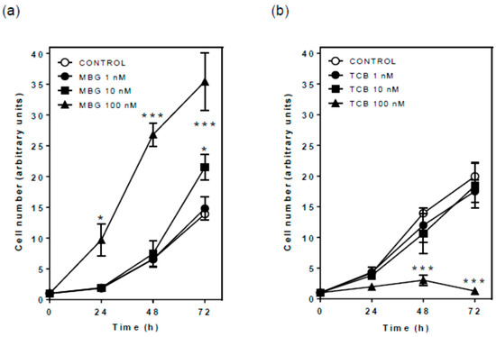 Figure 3. Cell proliferation of LLC-PK1 cells treated with marinobufagin (MBG) or telocinobufagin (TCB). Serum-starved LLC-PK1 cells were treated with 1, 10, and 100 nM MBG (a) or TCB (b) in 2.5% FBS for 24, 48, and 72 h, and then Trypan blue-free viable cells were counted in Neubauer chamber. Each point represents the mean ± SEM of three independent experiments performed in duplicate. * p < 0.05; *** p < 0.005 vs. control.