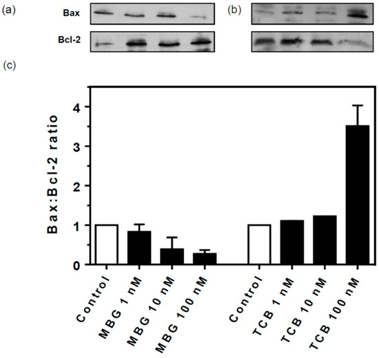 Figure 4. Bax and Bcl-2 expression in LLC-PK1 cells treated with marinobufagin (MBG) and telocinobufagin (TCB). Serum-starved LLC-PK1 cells were treated with 1, 10, and 100 nM MBG and TCB in 2.5% FBS for 72 h. Representative western blots of the pro-apoptotic Bax and anti-apoptotic Bcl-2 for MBG (a) and TCB (b) and the ratio of the relative optical density quantification for Bax:Bcl-2 (c). Data are the mean ± SEM of two independent experiments.