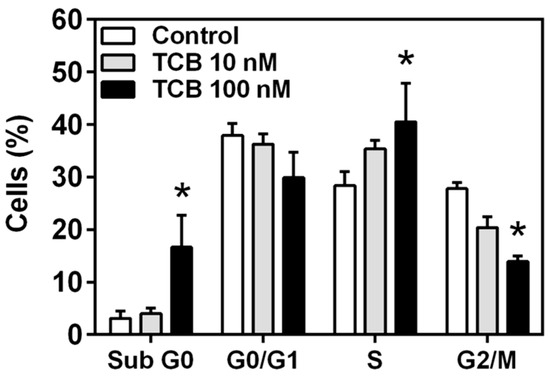Figure 5. Cell cycle analysis of LLC-PK1 cells treated with telocinobufagin (TCB) by flow cytometry. Serum-starved LLC-PK1 cells were treated with 10 and 100 nM TCB in 2.5% FBS for 48 h. Distribution of cells in the sub G0, G0/G1, S and G2/M phases of the cell cycle. Data are the mean ± SEM of three independent experiments in duplicate. * p < 0.05 vs. control.
