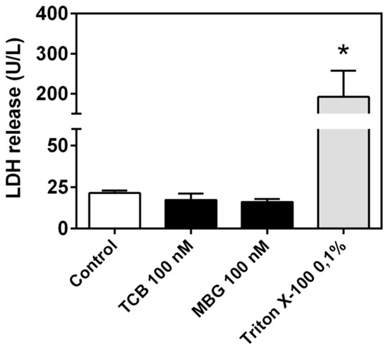 Figure 6. Lactate dehydrogenase (LDH) release from LLC-PK1 cells treated with telocinobufagin (TCB) or marinobufagin (MBG). Serum-starved LLC-PK1 cells were treated with 100 nM TCB or 100 nM MBG in 2.5% FBS for 72 h. Data are the mean ± SEM of three independent experiments in duplicate. * p < 0.05 vs. control. Triton X-100 was used as positive control.