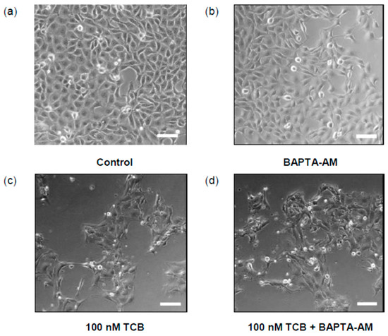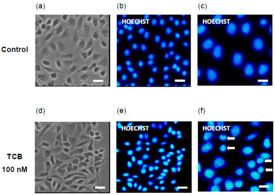 In 24-well plates, 5 × 103 LLC-PK1 cells/well were treated with 100 nM TCB for 24 h. For BAPTA-AM assay, cells were pretreated with 5 μM BAPTA-AM for 30 min and then treated with TCB. For nuclear fluorescence staining, cells were cultured in coverslips. After 24 h, they were washed with PBS, fixed with 4% paraformaldehyde for 10 min, washed again and then incubated with 0.2% Triton X-100 for 5 min. Cells were incubated with Hoechst 33,342 (1:10,000 dilution, Thermo Fisher Scientific, Waltham, MA, USA) for 30 min. Cells were examined and photographed by phase-contrast and fluorescence microscopy (Olympus CellSens Software 1.5, IX71 Olympus Microscope, Center Valley, PA, USA).