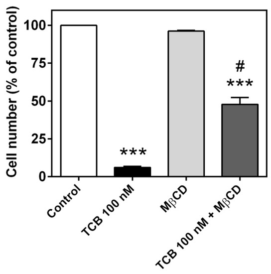 Figure 9. Effect of MβCD on cell proliferation of LLC-PK1 cells treated with telocinobufagin (TCB). Serum-starved LLC-PK1 cells were treated with 100 nM TCB and/or pretreated with 10 mM MβCD for 30 min and then with 1 mM MβCD in 2.5% FBS for 72 h and Trypan blue-free viable cells were counted in Neubauer chamber. Data are the mean ± SEM of three independent experiments in duplicate. *** p < 0.005 vs. control. # p < 0.005 vs. TCB.
