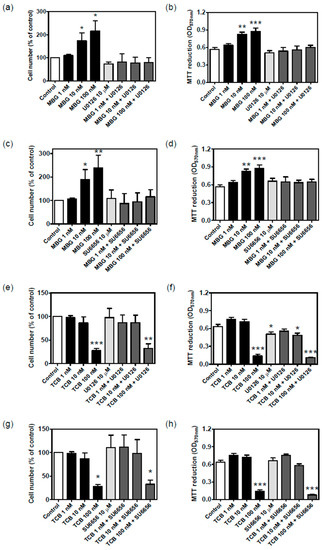 Figure 10. Effect of MEK1/2 and Src inhibition on cell proliferation and viability of LLC-PK1 cells treated with marinobufagin (MBG) and telocinobufagin (TCB). Serum-starved LLC-PK1 cells were treated with 1, 10, and 100 nM MBG (ad) and TCB (eh) in 2.5% FBS for 72 h with or without 10 μM U0126 (MEK inhibitor) (a,b,e,f) or 10 μM SU6656 (Src inhibitor) (c,d,g,h). Trypan blue-free viable cells were counted in Neubauer chamber (a,c,e,g) and viability was assessed by MTT (b,d,f,h). Data are the mean ± SEM of at least three independent experiments in duplicate. * p < 0.05; ** p < 0.01; *** p < 0.005 vs. control.