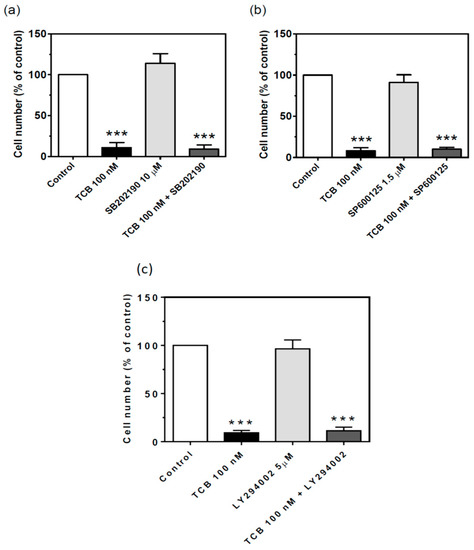 Figure 11. Effect of p38, JNK1/2 and PI3K inhibition on cell proliferation of LLC-PK1 cells treated with telocinobufagin (TCB). Serum-starved LLC-PK1 cells were treated with 100 nM TCB in 2.5% FBS for 72 h with or without 10 μM SB202180 (p38 inhibitor) (a), 1.5 μM SB600125 (JNK1/2 inhibitor) (b), or 5 μM LY294002 (PI3K inhibitor) (c). Trypan blue-free viable cells were counted in Neubauer chamber. Data are the mean ± SEM of at least three independent experiments in duplicate. *** p < 0.005 vs. control.