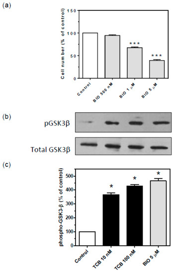 Figure 12. Effect of GSK-3β inhibition on cell proliferation and GSK-3β Ser9 phosphorylation of LLC-PK1 cells. Serum-starved LLC-PK1 cells were treated with 0.5, 1, and 5 μM BIO (GSK-3β inhibitor) in 2.5% FBS for 72 h (a), and 10 and 100 nM TCB and 5 μM BIO for 15 min (b,c). Trypan blue-free viable cells were counted in Neubauer chamber (a). Representative western blots of phospho- and total GSK-3β (b) and relative optical density quantification in (c). Data are the mean ± SEM of at least three independent experiments. * p < 0.05; *** p < 0.005 vs. control.