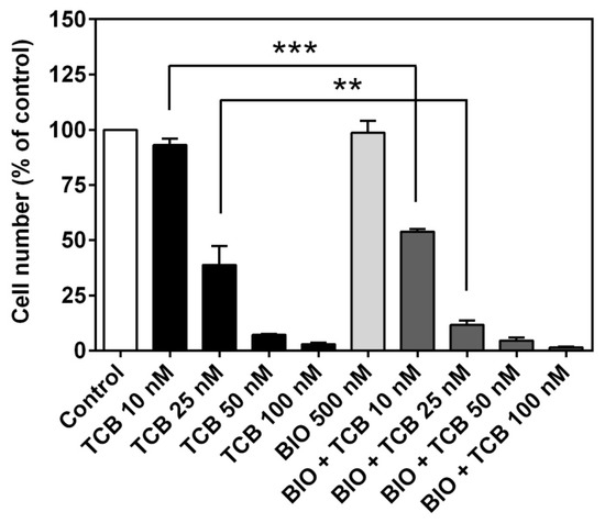 Figure 13. Effect of GSK-3β inhibition on cell proliferation of LLC-PK1 cells treated with telocinobufagin (TCB). Serum-starved LLC-PK1 cells were treated with 10, 25, 50 and 100 nM TCB in 2.5% FBS for 72 h with or without 500 nM BIO (GSK-3β inhibitor). Trypan blue-free viable cells were counted in Neubauer chamber. Data are the mean ± SEM of at least three independent experiments in duplicate. ** p < 0.01 vs. TCB 25 nM; *** p < 0.005 vs. TCB 10 nM.