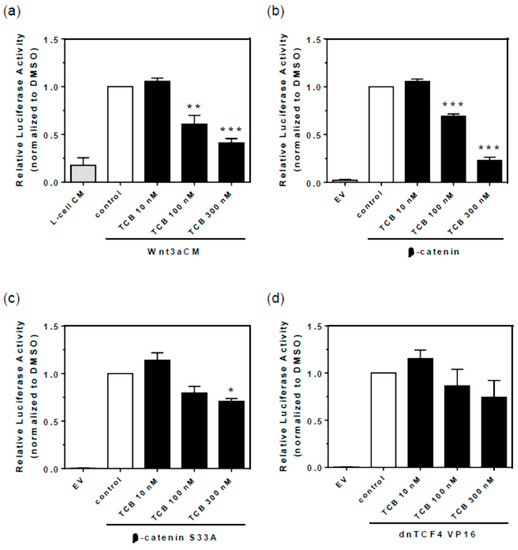 Figure 14. Wnt/β-catenin signaling inhibition by TCB relies on β-catenin phosphorylation and degradation. Wnt/β-catenin signaling pathway specific TOPFLASH gene reporter assay for LLC-PK1 cells treated with 10, 100, and 300 nM TCB with control L-cell (L-cell CM) or Wnt3a conditioned medium (Wnt3a CM) for inducing Wnt/β-catenin pathway for 24 h (a). Cells were transfected with β-catenin, a constitutively active β-catenin mutant (b), β-catenin S33A (c), or constitutively active TCF4 construct dnTCF4 VP16 (d). Data are the mean ± SEM of at least three independent experiments. * p < 0.05; ** p < 0.01; *** p < 0.005 vs. control. EV, empty vector.