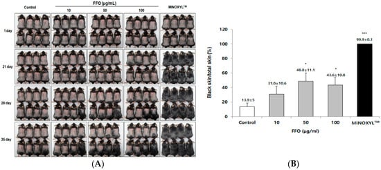 The ex vivo culture of follicles does not fully reflect in vivo environments, but it is a miniorgan commonly used as an experimental model to test the effects on hair growth as it is composed of several cell types, including dermal papilla cells, matrix cells and stem cells []. It is used as a model as it is easy to see which cells proliferate or die, and changes in the expression of specific proteins []. In this study, we observed that vibrissa follicles cultured with FFO extract (12.5 µg/mL) could promote hair growth, supporting the effect of minoxidil reported in previous studies []. However, the concentrations of FFO extract that were significantly effective ex vivo vibrissa follicle culture were lower than those that were most effective in vivo and in vitro results. This concentration difference is thought to be due to the FFO extract added to the culture media changed every three days during follicle culture or as a result of interactions between various cells within the follicles, as described in our previous reports [,]. The skin color of C57BL/6 mice changes from pink (telogen) to black (anagen), leading to frequent use of this model in hair cycle and hair growth studies []. As expected, it was found that hair growth in areas of mouse skin topically applied with FFO extract was significantly greater than that of the control mice (Figure 2A,B). These ex vivo and in vivo results suggest the potential of FFO as a new material for inducing hair growth and treating hair loss.