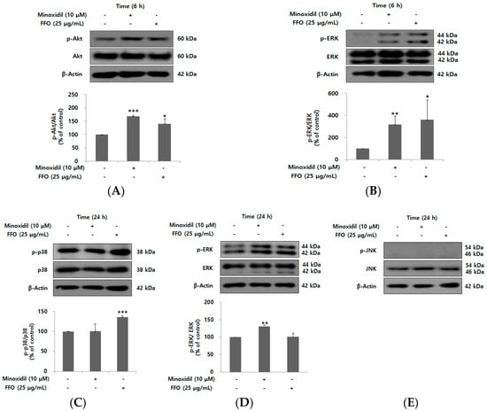 Proliferation of DPC by minoxidil has also been shown to be due to Akt activation with PI3K/Akt being associated with an anti-apoptotic effect [,]. To examine whether the proliferative effect of FFO extract was induced by activation of PI3K/Akt signaling proteins, DPC were stimulated with 25 μg/mL FFO extract for 6 h. The level of phospho-Akt was significantly increased by FFO extract (Figure 4A). The mitogen-activated protein kinase (MAPK) signaling pathway, including ERK, p38 and c-Jun N-terminal kinase (JNK), regulates diverse cellular responses, such as cell proliferation and death []. We thus examined the changes in the phosphorylation of ERK, p38 and JNK after FFO extract treatment for 6 or 24 h. As shown in Figure 4B–E, FFO extract significantly increased the level of phospho-ERK at 6 h and phospho-p38 at 24 h, but did not affect the level of phospho-JNK in DPC. Minoxidil showed similar results to those reported by Kim et al., where the proliferation of human DPC was increased through the activation of Akt and ERK [].