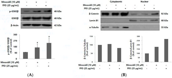 The effect of FFO extract on the level of Wnt/β-catenin signaling proteins. (A) DPCs were stimulated with minoxidil (10 μM) or FFO extract (25 μg/mL) for 18 h. The levels of phospho-GSK3β and GSK3β were determined using an immunoblot. The graph represents the quantitative level of the proteins. The data are presented as the mean ± SD from three independent experiments. * p < 0.05 vs. vehicle-treated control. (B) DPCs were stimulated with minoxidil (10 μM) or FFO extract (25 μg/mL) for 56 h. Cytoplasmic and nuclear fractions were prepared as described in Section 4. The protein level of β-catenin was determined using an immunoblot. α-Tubulin and lamin B1 were used to confirm the same loading of cytoplasmic and nuclear proteins. The graph represents the quantitative level of the proteins.