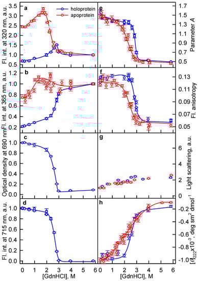 At a concentration of GTC from 1.0 to 1.5 M, the tryptophan fluorescence intensity of the iRFP713 holoform increased (Figure 1a,b, blue lines). A minor but clearly distinguishable growth of the optical density of BV was also detected (Figure 1c), the absorption spectra in the visible region of the spectrum under these experimental conditions is typical of that for free BV (the figure is not present). This indicated an increase in the portion of dissolved molecules of the denatured protein in this range of the denaturant concentrations. The unfolding of iRFP713 in the holoform occurred in the range of 1.1–1.7 M GTC and was accompanied by a decrease in the values of the parameter A and fluorescence anisotropy (Figure 1e,f, blue lines). The values of the parameter A and fluorescence anisotropy of iRFP713 in the holoform nearly coincided in the denaturing transition region with the values of those characteristics of the apoprotein (Figure 1e,f). As in the range of GTC concentrations where the holoprotein unfolds, BV is no longer embedded in the protein structure (Figure 1d), so the holoprotein and the apoprotein behave identically under these conditions.