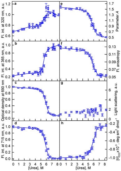 - Povarova, O.I.; Kuznetsova, I.M.; Turoverov, K.K. Differences in the pathways of proteins unfolding induced by urea and guanidine hydrochloride: Molten globule state and aggregates. PLoS ONE 2010, 5, e15035. [Google Scholar] [CrossRef] [PubMed]